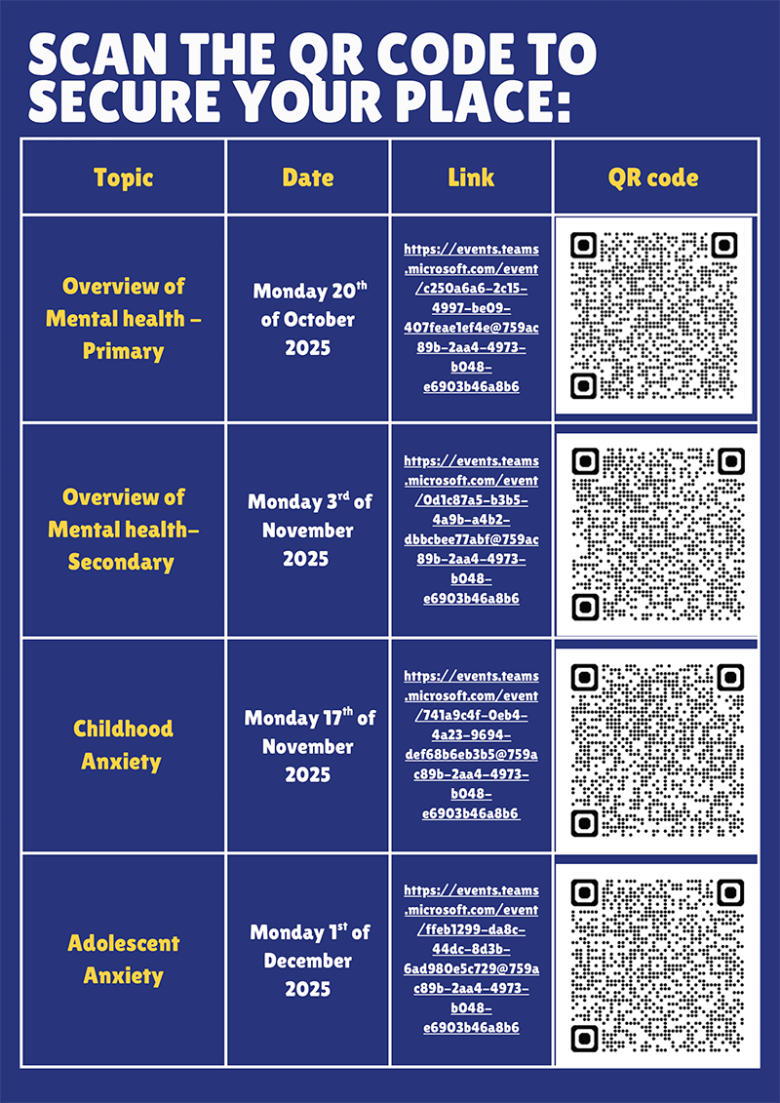 To sign up you just need to scan the QR code in the attachment below. Topics include Anxiety, Exam Stress, and many more. If you feel your child would benefit from working with the Mental Health Support Team please speak to a member of the Safeguarding Team.