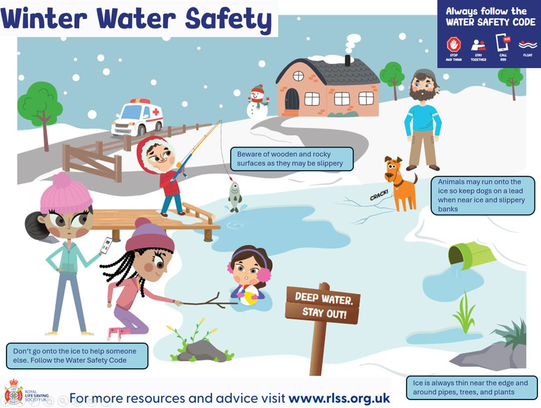 🆘 If someone falls in, do not go onto the ice to help – call 999 and follow the Water Safety Code