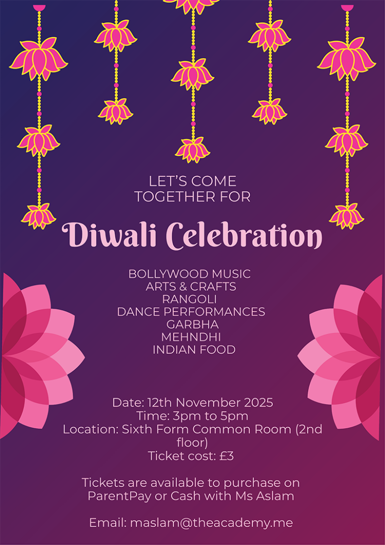 We are holding our annual Diwali Celebration on Wednesday 12 November from 3pm to 5pm in the Sixth Form Common Room. *Please note: This is a change of date*.