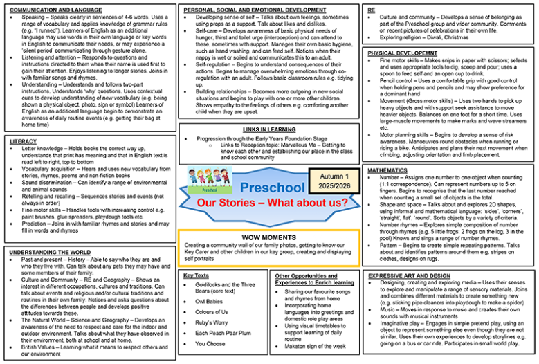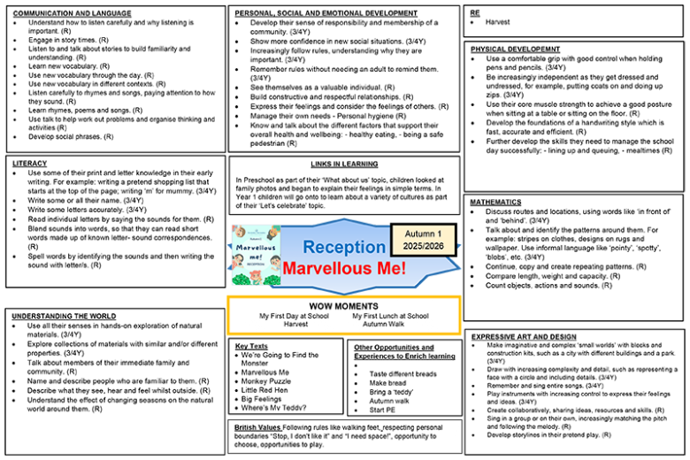 The Curriculum is divided into three Prime Areas - Personal, Social and Emotional Development; Physical Development; Communication and Language and four Specific areas - Literacy; Mathematics; Understanding the World; Expressive Arts and Design. Each area provides expectations for a child's development within specific age brackets culminating in an early learning goal. Staff use the curriculum to help trace each child's progress throughout their time in EYFS. Children work towards being able to achieve these early learning goals by the end of their reception year in school. By focusing on these areas, children form a firm foundation on which to build future learning and help them develop the skills necessary for developing reading and writing, for understanding of the world and for engaging with the arts and design.