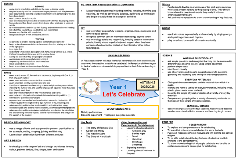 In Key Stage One (and particularly Year 1) children experience a similar environment to that of the Early Years Foundation Stage to ensure there is a smooth transition between the year groups, increasing formality as they progress towards the end of Year 2. Once children have completed the Early Years Foundation Stage they follow the programmes of study from the National Curriculum and the Buckinghamshire Agreed Syllabus for Religious Education. Children participate in daily Read Write Inc, phonics lessons and daily guided reading sessions, which are set by ability and are additional to daily English and mathematics lessons.