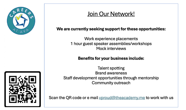 Please contact our careers leader, Mrs V Proud on 01296 428551 or via email at vproud@theacademy.me if you would like to find out further information on careers events and how we can work together.